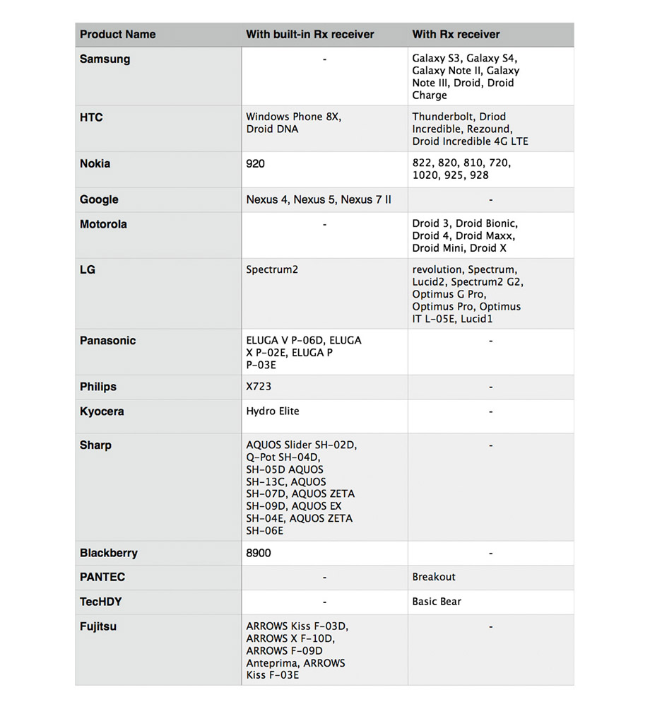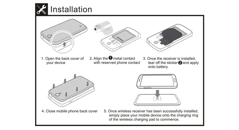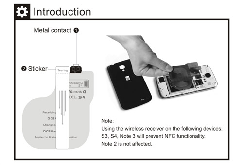 | | О LUXA2 Wireless Receiver Wireless Receiver представляет собой устройство, обеспечивающее беспроводную передачу энергии от источника (беспроводное зарядное устройство) к приемнику (смартфон) на основе электромагнитной индукции. Металлические контакты присоединяются к специальной площадке для беспроводной зарядки вашего устройства Samsung, а клейкая полоска соединяется с задней стороной батарейного блока. | | | | | Пошаговая инструкция по установке Шаг 1: Снимите заднюю крышку смартфона. Шаг 2: Достаньте Wireless Receiver из коробки и снимите с него клейкую ленту. | | | | | Пошаговая инструкция по установке Шаг 3: Соедините металлические контакты Wireless Receiver с контактной площадкой для беспроводной зарядки вашего устройства Samsung. | | | | | | | Пошаговая инструкция по установке Шаг 4: Плотно прижмите Wireless Receiver к аккумуляторной батарее. | | | | Пошаговая инструкция по установке Шаг 5: Убедитесь, что Wireless Receiver установлен именно так, как показано на картинке. Шаг 6: Установите заднюю крышку вашего смартфона на место. | | | | | | | | | | Таблица совместимых устройств Ниже перечислен список моделей мобильных устройств, с которыми совместим беспроводной. | | | | | | | LUXA2 Wireless Receiver совместим со следующими продуктами | | | | | | Что в коробке? Подробное руководство пользователя, содержащее четкие и понятные инструкции по установке Wireless Receiver. Тщательно упакованный в прочную пластиковую коробку Wireless Receiver для Samsung Galaxy S3/4 или Galaxy Note 2/3. | | |